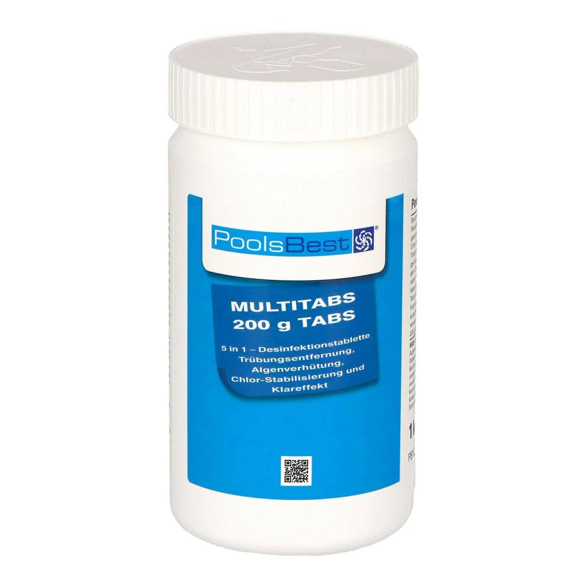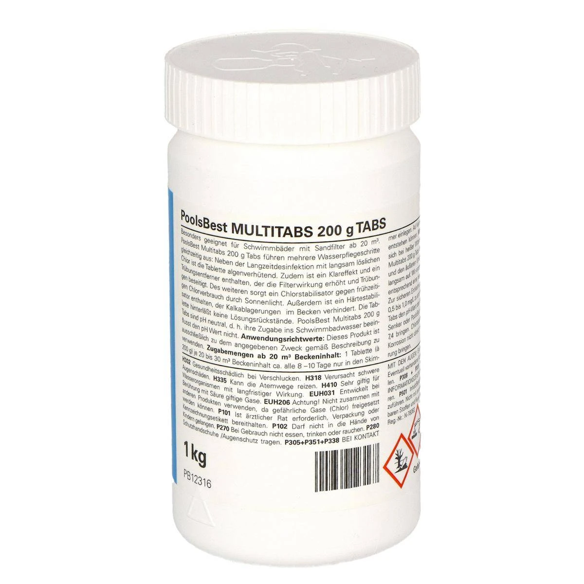 Während der Urlaubspflege hält die Wirkung bei reduzierten Filterlaufzeiten länger an, das Wasser bleibt klar und sauber. PoolsBest® Multitabs 200 g Tabs zeichnen sich besonders durch ihre hohe Leistungsreserve aus. Die Zugabemengen erhöhen sich bei heißer Witterung sowie hoher Besucherzahl. Die Multitabs Tabletten löst sich je nach Wetterlage, Wassertemperatur und den äußeren Umständen innerhalb von 3-14 Tagen unterschiedlich langsam auf. Wir empfehlen vor dem Auflösen und je nach Chlorwert entsprechend eine neue Poolsbest® Multitabs 200 g nachzulegen.