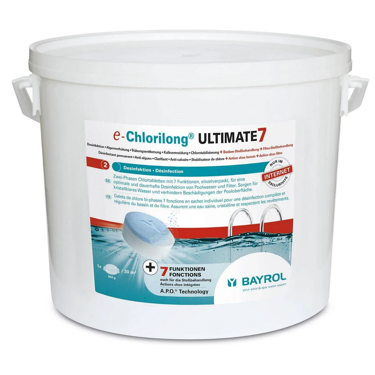 - 7 Funktionen: Desinfektion, Algenverhütung, Flockung, Kalkvermeidung, Chlorstabilisierung, Poolwasser- und Filter-Stoßbehandlung