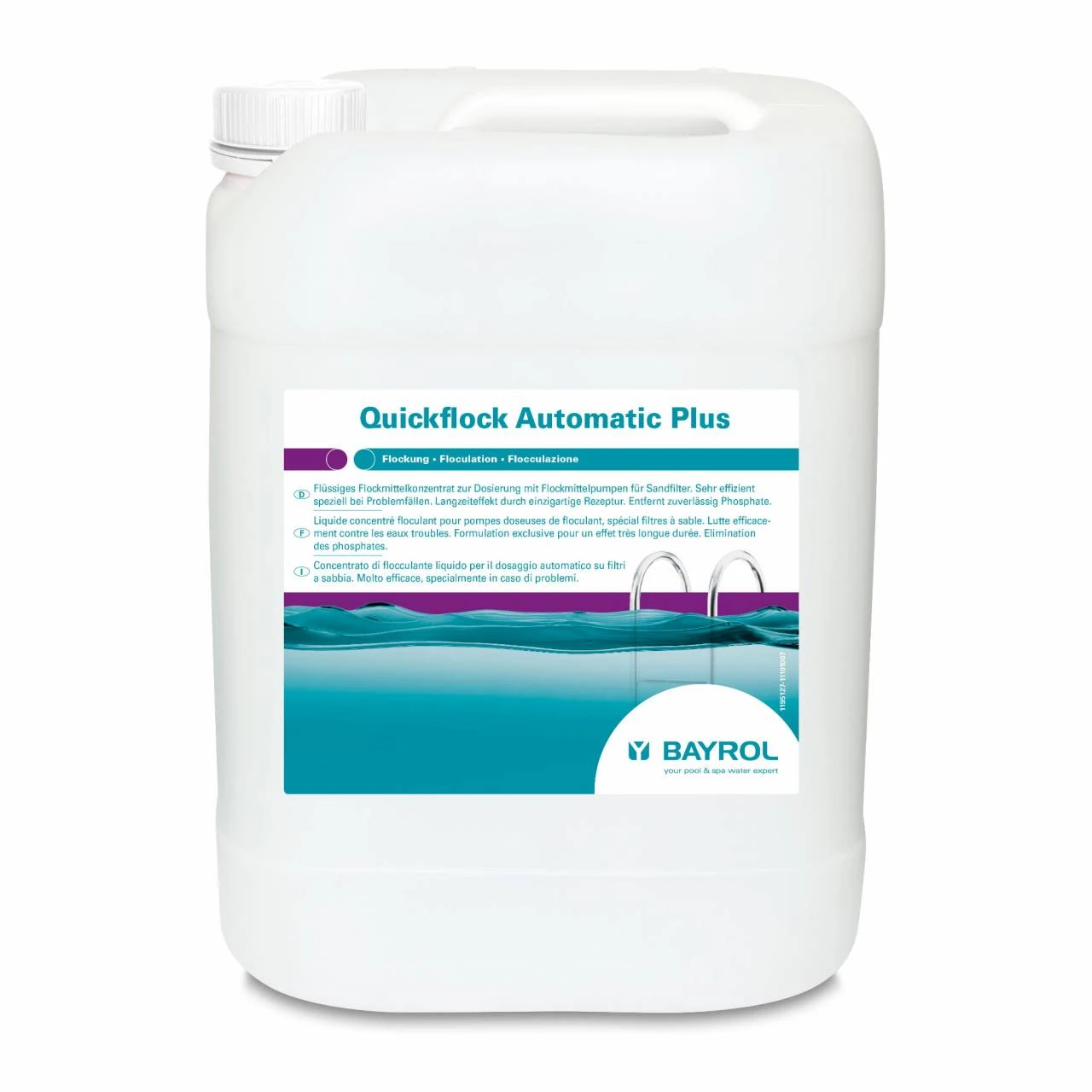 Quickflock Automatic Plus ist ein flüssiges Flockmittel-konzentrat für Sandfilter zur effektiven Entfernung von feinsten Schwebeteilchen im Wasser, die zu Trübungen führen können. Durch das zusätzlich enthaltene Lanthan werden außerdem zuverlässig Phospate aus Ihrem Poolwasser entfernt. Dies beugt Algenwachstum vor.
