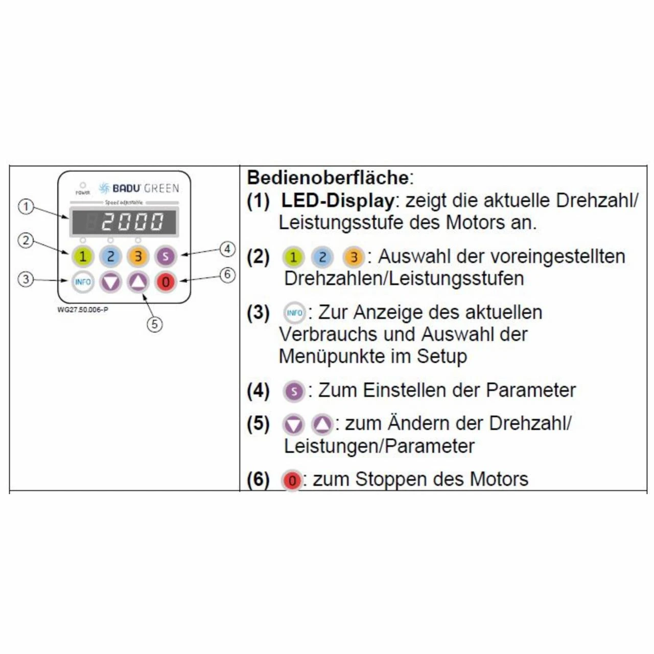Die selbstansaugende Umwälzpumpe BADU Prime Eco VS vereint die erfolgreiche Konstruktion der BADU Prime mit einem Synchron-Kompaktantrieb zu einem hocheffizienten, leistungsstarken Kraftpaket. Dank integrierter Bauweise ist sie äußerst platzsparend und ideal für Becken mit einer Größe von 30 bis 90 m³. Per integrierter Leistungselektronik ist die Pumpe in ihren Parametern variabel programmierbar und birgt damit Energie-Einsparmöglichkeiten. Das Motordisplay sorgt als bewährtes Bedienteil für unkomplizierte und intuitive Handhabung. Die logische Menüführung folgt dabei ganz dem Motto „keep it simple“. Potenzialfreie Kontakte sorgen zudem dafür, dass Off-Funktion und Drehzahlen auch von extern über die Pumpen-Fernsteuerung BADU Eco Logic ansteuerbar sind.